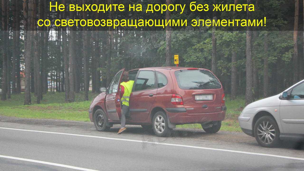 Выходить на проезжую часть без надобности не следует, и только в аварийном жилете, который обязательно возите всегда в салоне автомобиля. Человека на дороге в таком жилете со световозвращающими элементами видно издалека.