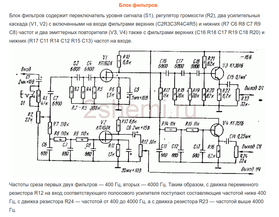 Как уже писал ваше, выбрал первую схему из-за довольно качественной фильтрации полос и соответствии частот разделения полос заданным. Только на выходах каждого канала (полосы) были добавлены простые регуляторы уровня усиления (как это сделано, например, в третьей схеме, на транзисторах). Регуляторы можно поставить от 30 до 100 кОм. Операционные усилители и транзисторы во всех схемах можно заменить на современные импортные (с учётом цоколёвки!) для получения лучших параметров схем. Никакой настройки все эти схемы не требуют, если не требуется изменить частоты раздела полос. К сожалению, дать информацию по пересчёту этих частот раздела я не имею возможности, так как схемы искались для примера «готовые» и подробных описаний к ним не прилагалось.