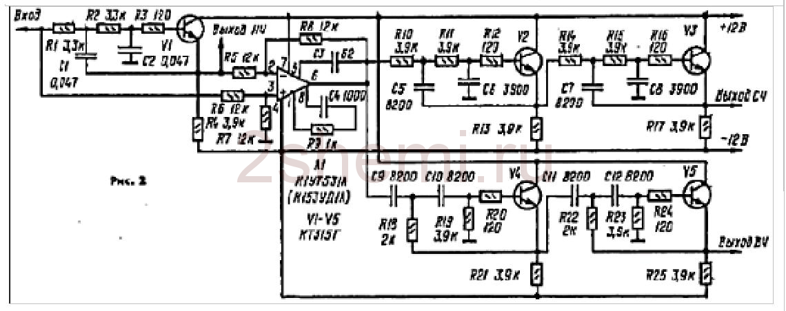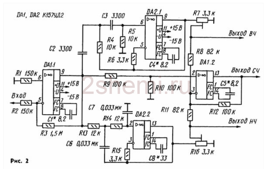 — схема, которая была применена мной в этом усилителе, так как частоты раздела полос оказались как раз такие, которые и нужны были «заказчику» — 500 Гц и 5 кГц и ничего пересчитывать не пришлось.
