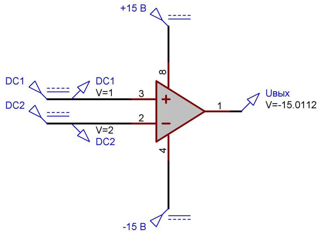 Давайте теперь на инвертирующий вход подадим потенциал больше, чем на НЕинвертирущий. На инвертирующий подаем 2 Вольта, а на НЕинвертирующий подаем 1 Вольт:
