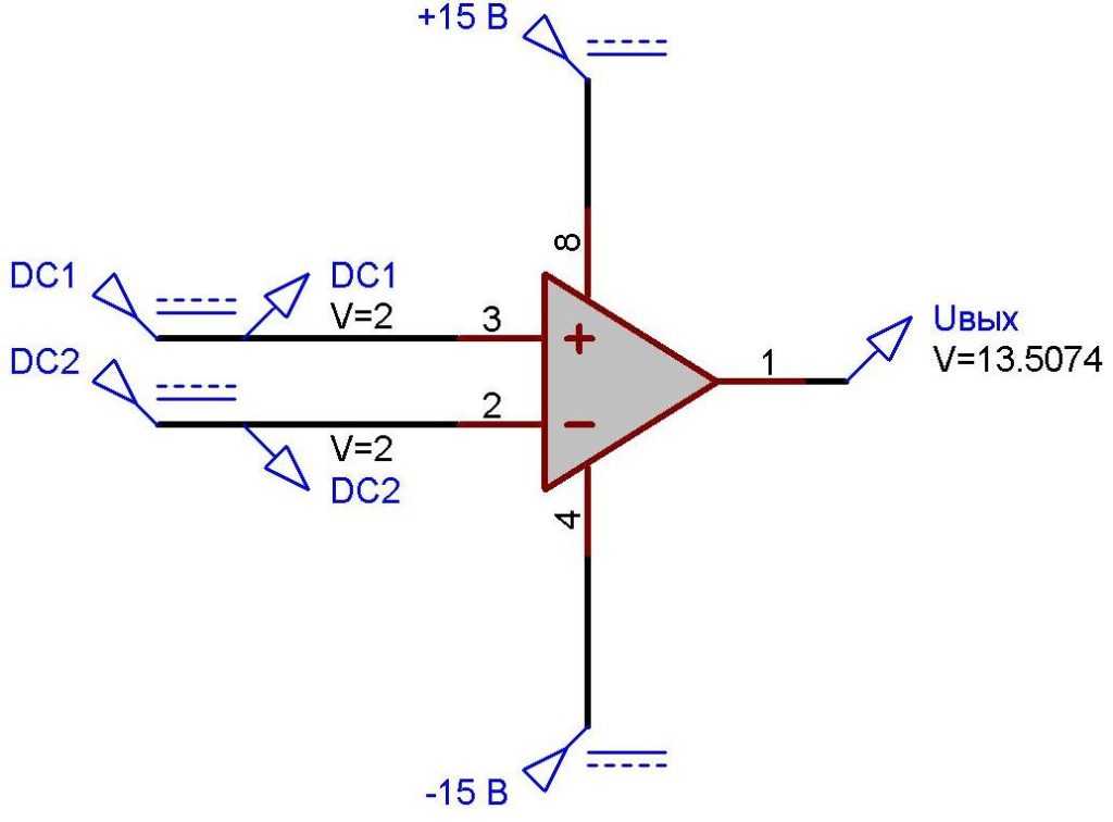Подадим на НЕинвертирующий вход 2 Вольта, а на инвертирующий вход 1 Вольт. Так как на НЕинвертирующем входе потенциал больше, то следовательно, на выходе мы должны получить +Uпит. Мы получили 13,5 Вольт, что близко к этому значению