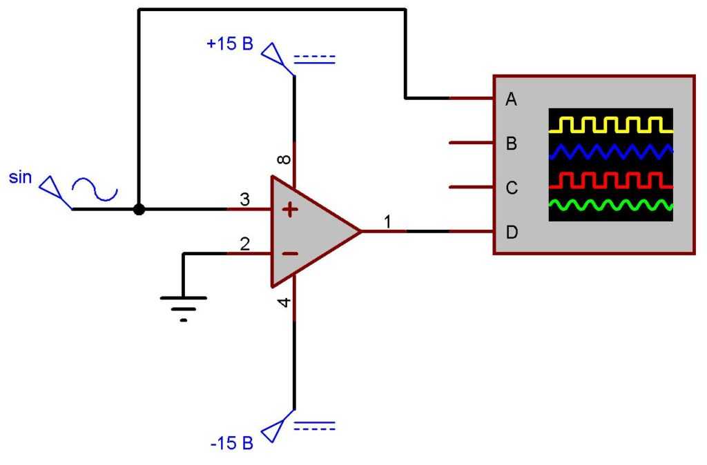 Давайте подадим синусоидальный сигнал амплитудой в 1 Вольт и частотой в 1 килоГерц на НЕинвертирующий вход, а инвертирующий посадим на землю, то есть на ноль.