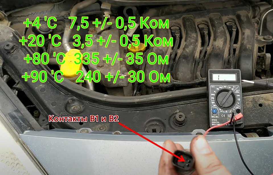 Дальше, сели не хотите снимать датчик температуры ОЖ с двигателя, с помощью тестера замерьте показания сопротивления на прогретом и холодном моторе между выводами датчика «В1» и «В2».