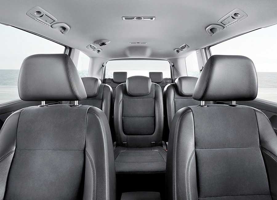 Посадка в салон автомобиля может осуществляться через передние двери, открывающиеся на достаточно большой угол, две сдвижных двери. Не возникает вопросов к эргономике, а качество использованных материалов на уровне, достойном автомобильного концерна VAG. Четко выверенное водительское место, удобное рулевое колесо, уже классическая приборная панель с двумя циферблатами и экраном бортового компьютера… Приборная панель «перетекает» в центральную консоль с традиционным расположением элементов управления мультимедийной системы, контроллерами управления системой кондиционирования иотопления салона. Во втором ряду есть три полноценных сиденья, которые можно регулировать в продольном направлении независимо друг от друга на 160мм, что обеспечивает комфортную посадку пассажирам. В зависимости от комплектации в данной модели может устанавливаться и третий ряд сидений, где могут комфортно разместиться дети.