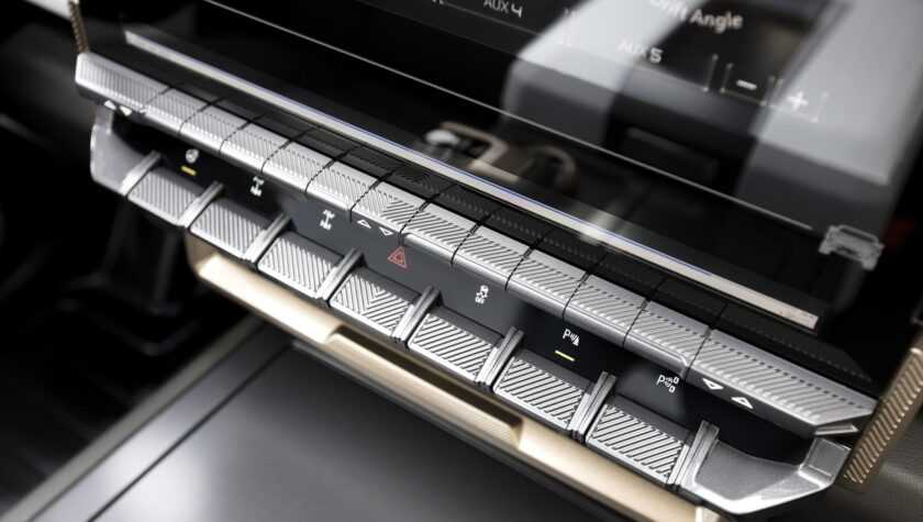 Напоследок рассмотрим водительское место Hummer EV. Первое, что бросается в глаза – цифровая панель приборов. Основой послужил цветной дисплей на 12,3″, выполненный в виде планшета и без какого-либо защитного козырька. По стандарту в память приборной панели занесено несколько режимов настройки, но не исключен вариант индивидуального расположения элементов. Пока остается под вопросом, как поведет себя дисплей при ярком солнечном освещении и хорошо ли будут заметны показатели на дисплее.