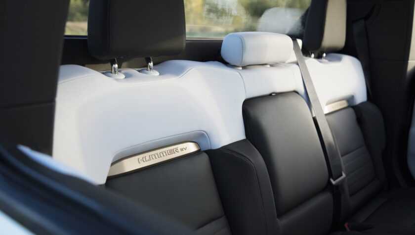 Второй ряд сидений Hummer EV практически не отличается от обычного пикапа, три посадочных места с отдельными подголовниками и высокая удобная спинка. Секрет в том, что при необходимости можно сложить нижнюю часть сиденья, тем самым увеличив пространство для небольшого груза. Зачастую производители пикапов пытаются в этом месте установить дополнительные отсеки для инструмента, но в данной модели решили оставить свободное пространство.