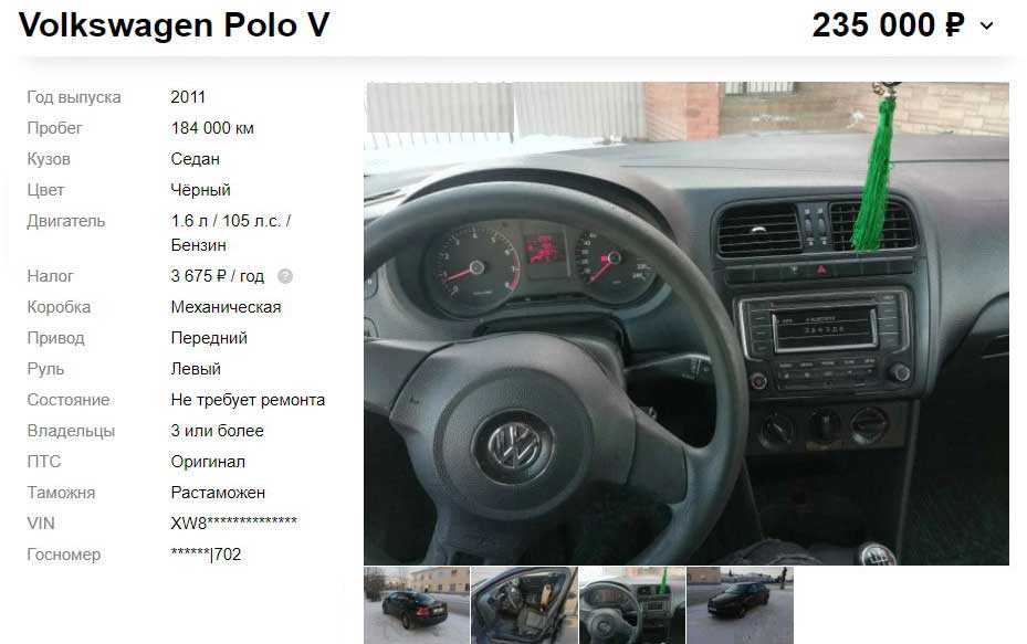 К примеру, за 235 000 р. можно приобрести Volkswagen Polo V 2011 года с пробегом 184 000 км, двигателем 1.6 на 105 л.с. с МКПП 5.