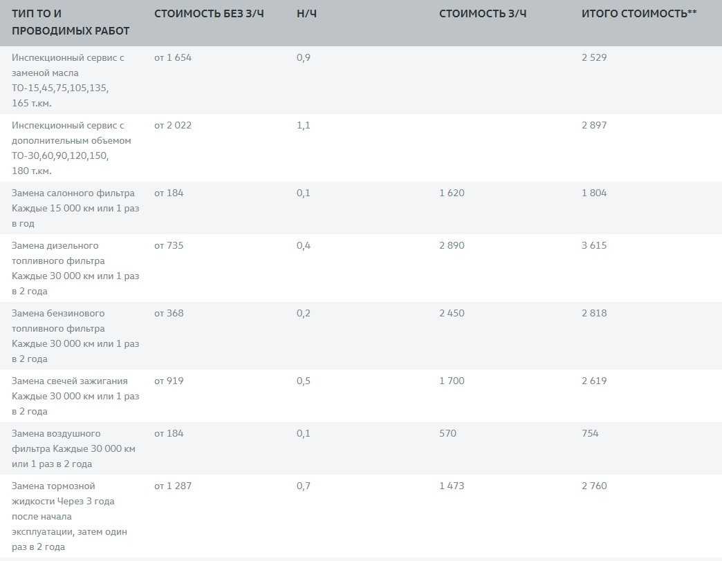 Техническое обслуживание в сервисах от 8000 р. Работы по замене масла, которые рекомендовано делать каждые 15 000 км пробега, от 600 р. без учета стоимости масла.