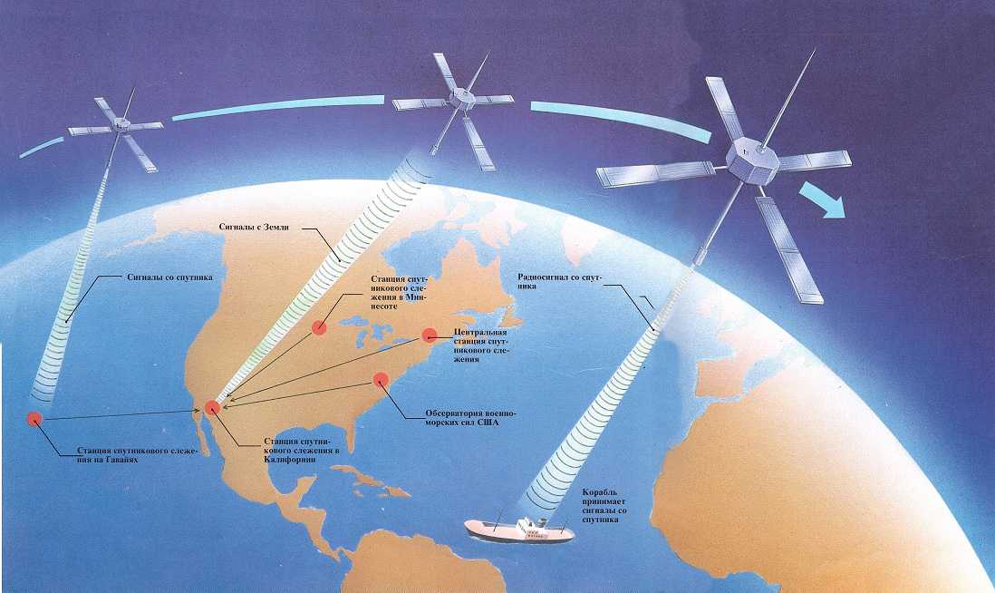 Затем навигационный компьютер на корабле определяет расстояние между ними и летящим в небесах спутником. Эти вычисления компьютер повторяет через определенные промежутки времени и в конечном итоге получает данные о широте и долготе, то есть свои координаты.