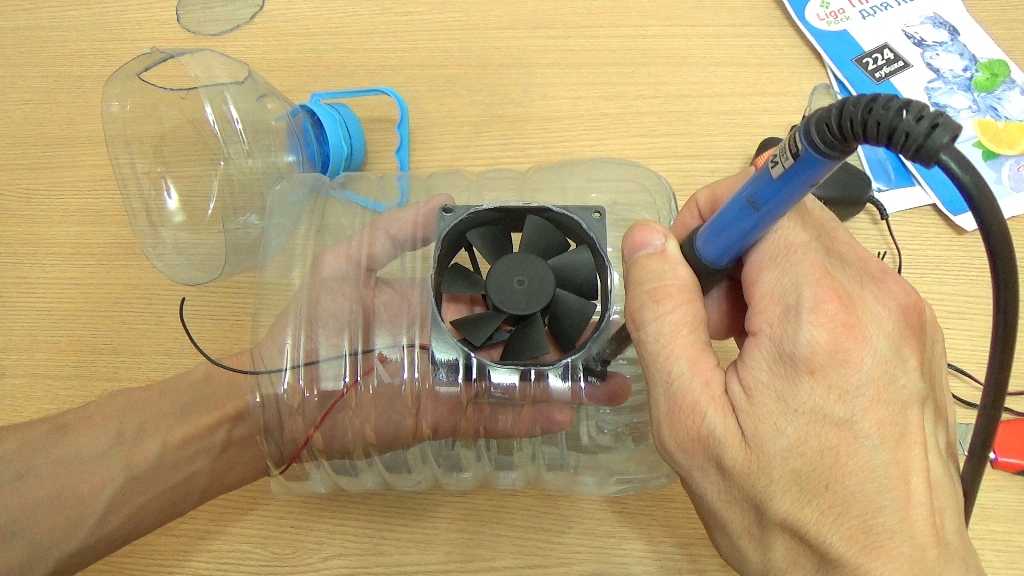 Располагаем канистру в горизонтальном положении так, чтобы горлышко смотрело в сторону. В верхней её части нужно вырезать отверстие, соответствующее диаметру лопастей кулера от компьютера. Сам вентилятор прикручиваем саморезами к канистре. Затем припаиваем провода с одной стороны к кулеру, а с другой стороны можно приделать штекер для прикуривателя или просто напрямую подключиться к проводке машины. На этом можно считать, что простейший кондиционер практически готов.