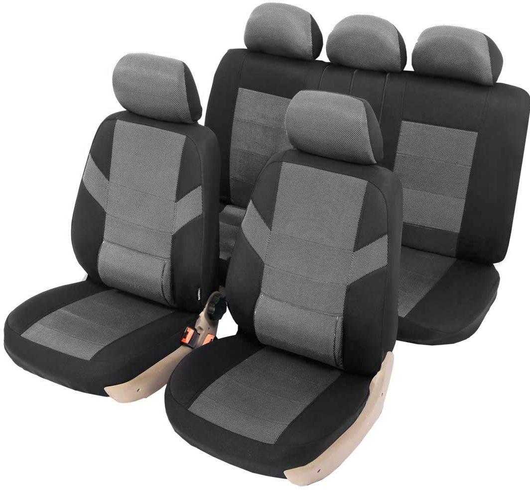 В комплект входит 9 предметов. Чехлы размещаются на передних креслах и одном заднем. Дополнительно предусмотрены подголовники и накидка на оборотную сторону водительского сиденья с карманами на молниях.