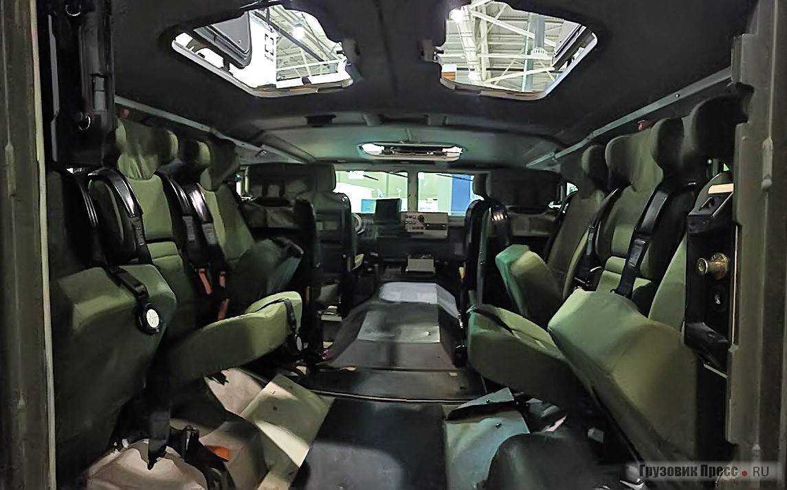 Вместимость у нашей машины выше — два члена экипажа и двенадцать десантников (у модификации 63095, где кабина отделена от десантного модуля, их и вовсе 14).