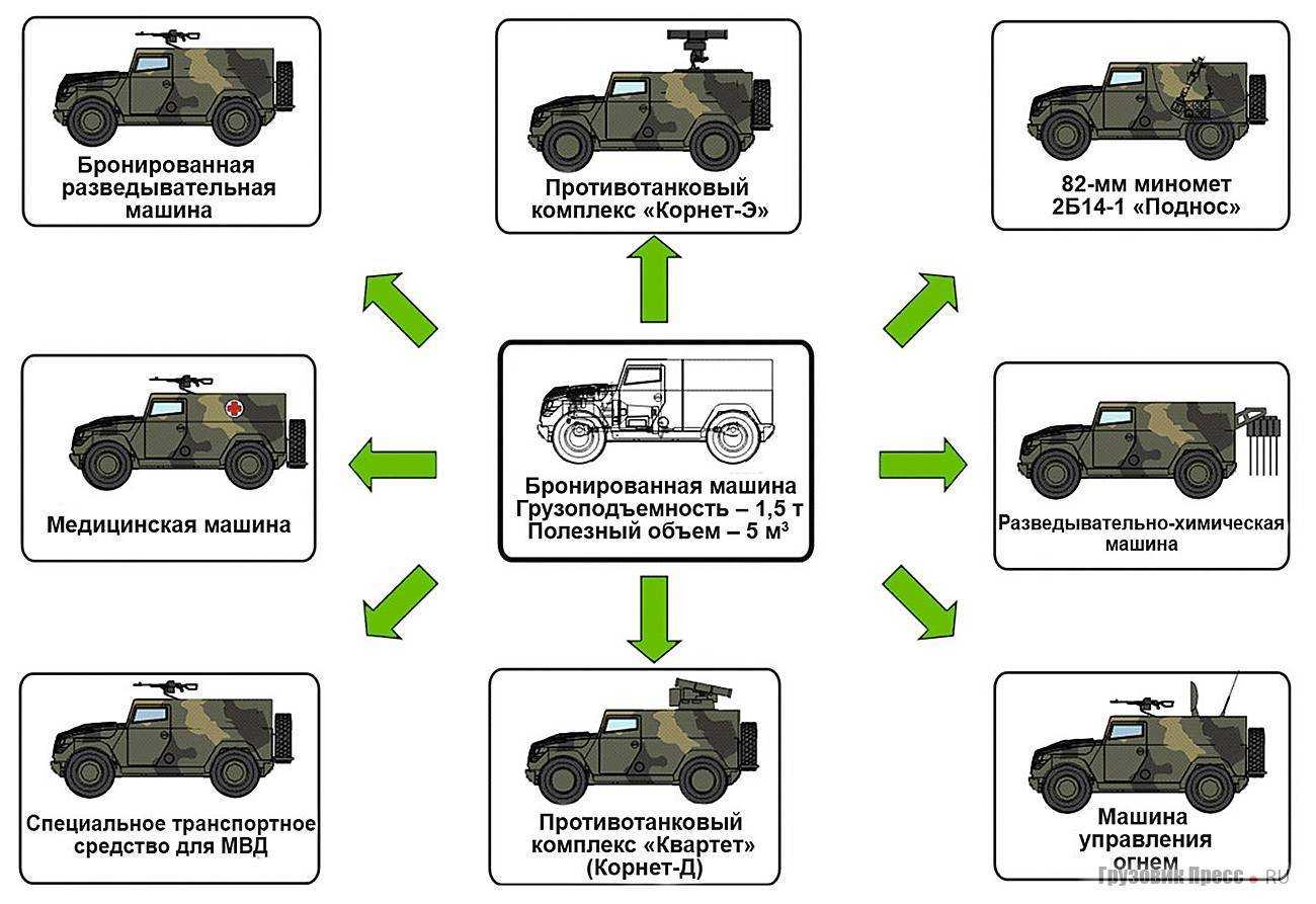Существует два варианта этих автомобилей: защищенный, с кузовом для экипажа до 10 человек – для МО и других силовых структур, и автомобиль гражданского назначения с различными грузопассажирскими кузовами. В гражданском варианте автомобили выпускаются заводом с 2005 года, а автомобили для МО заканчивают сейчас государственные испытания.