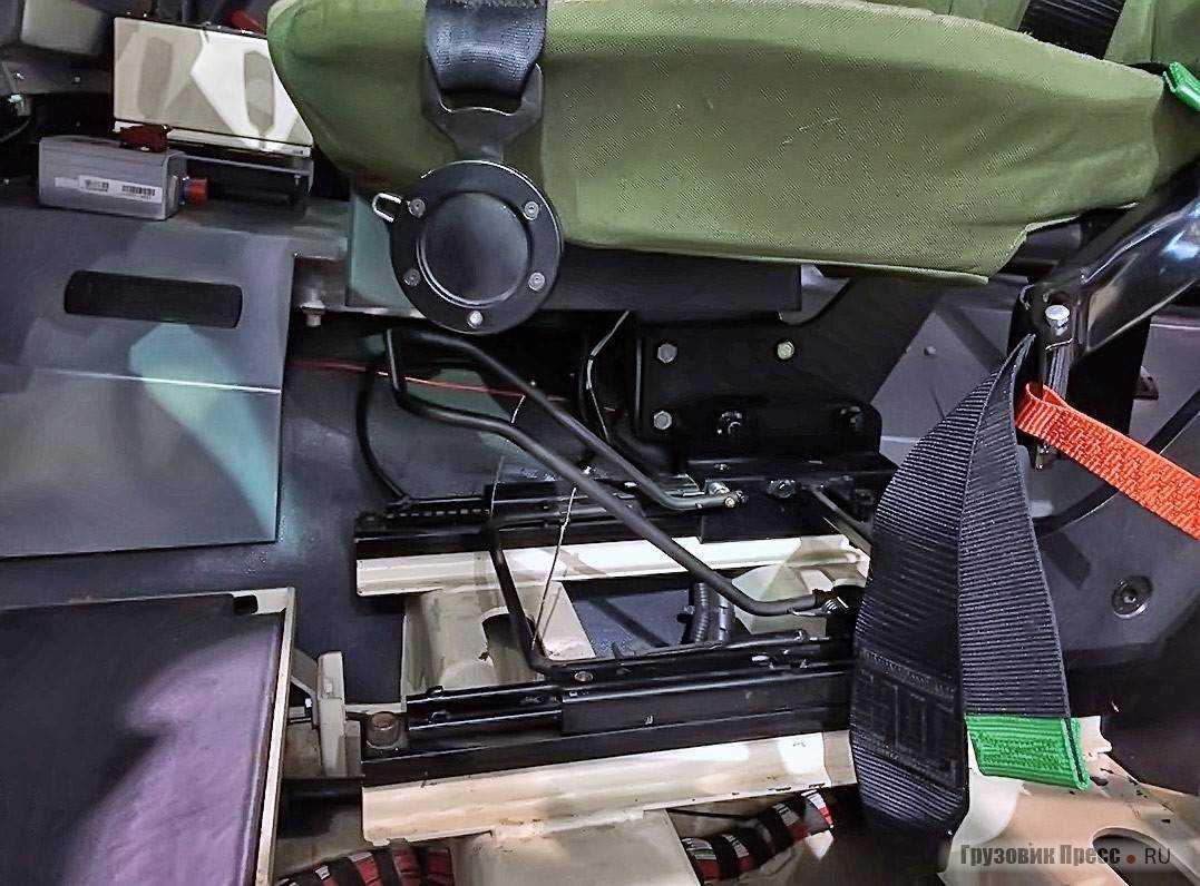 А что с защитой нашего экипажа и десанта? Бронекапсула с V-образным днищем способна выдержать взрыв до 8 кг в тротиловом эквиваленте. Это больше, чем заявлено у «американца». В салоне Урала на подвесах смонтированы поглощающие энергию взрыва кресла с индивидуальными ремнями безопасности. Сиденья достаточно просторные, поскольку рассчитаны на бойцов в полной экипировке «Ратник».