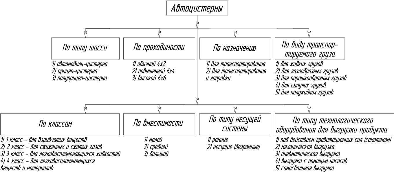- а) по типу базового шасси – автомобиль-цистерна, прицепцистерна, полуприцеп-цистерна;