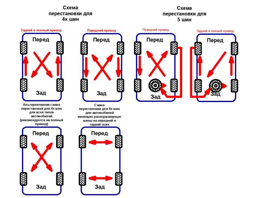 Различные схемы перестановки шин для задне и полноприводных автомобилей Также ввиду наличия современных шин появилась необходимость в еще 2 схемах ротации: