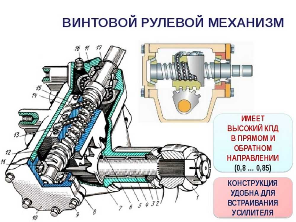Винтовая. Напоминает червячную. Однако вместо вала и шестерни в данном случае используются винт и рейка с винтовой резьбой. При этом полости между деталями заполнены шариками, напоминающими подшипниковыми. В общих чертах принцип действия этой конструкции напоминает схему работы червячной передачи. Однако она имеет ряд преимуществ по сравнению с последней. Основное из них – более высокий КПД. В качестве недостатка подобной конструкции можно назвать ее относительную сложность – в случае износа одного из шариков замену ему придется подбирать точно по диаметру, а это удается не всегда с первого раза. В противном случае возникнет повышенное трение и механизм не будет нормально функционировать. Чаще всего устанавливается на большегрузные автомобили, хотя иногда встречается и на легковых.