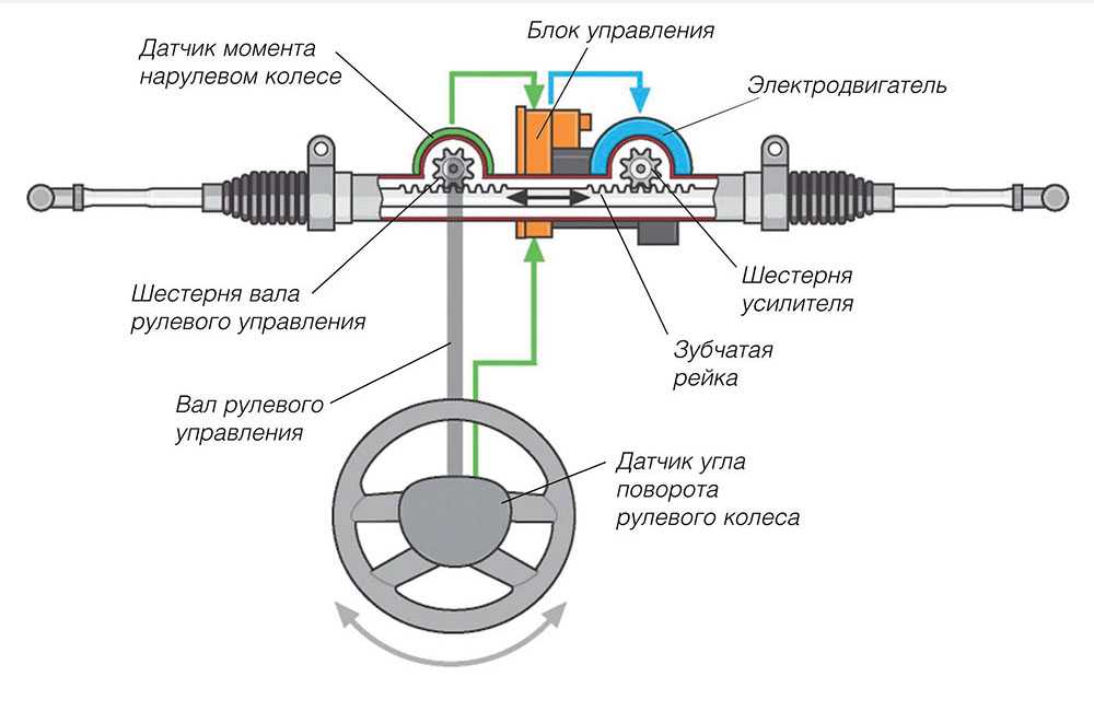 Работает такой механизм очень просто: водитель, как и на авто без усилителя, посредством шестерни перемещает рейку. В то же время блок управления включает в работу электродвигатель, который благодаря зубчатому зацеплению помогает ее перемещать.