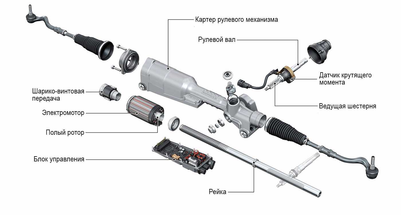 Как отмечено, в устройстве ЭУР применяются одни и те же составные элементы, но с разной компоновкой. Все применяемые электрические усилители рулевого управления можно разделить на: