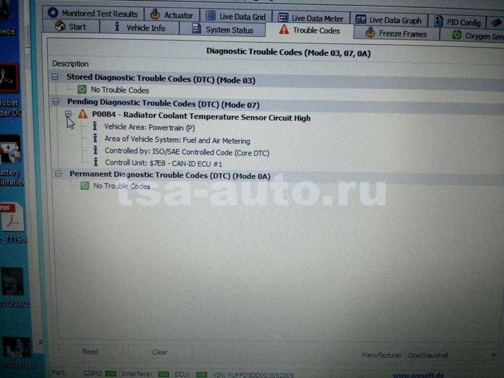 Но она была не постоянно, пока снимал разъемы появилась, после нескольких сбросов появляться перестала, но как показала практика именно она указывает на не исправный термостат. Вот ошибка при отключенном датчике на радиаторе p00b4