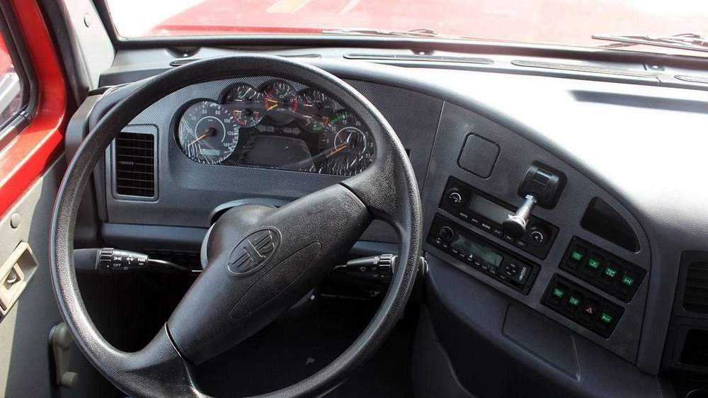 Приборная панель в автомобиле обита «деревопластиком». Выделяется и кожаный руль, отличающийся легкостью поворота. Салон грузовика свободно вмещает двух человек, но втроем в кабине будет дискомфортно. Руль и кресла можно регулировать. Спинка сиденья наклоняется на 25 градусов. Также присутствуют 3-точечные ремни безопасности. Со своего места водитель может контролировать все индикаторы, выключатели и приборы. Пультами и стрелками приборная доска не изобилует, что позволяет быстро найти нужный элемент.