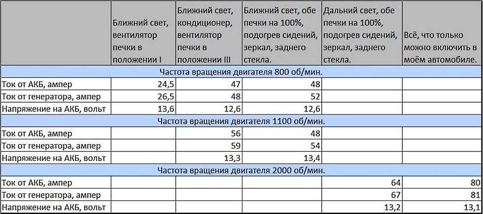 Таблица 1. Сколько ампер выдает генератор под нагрузкой.