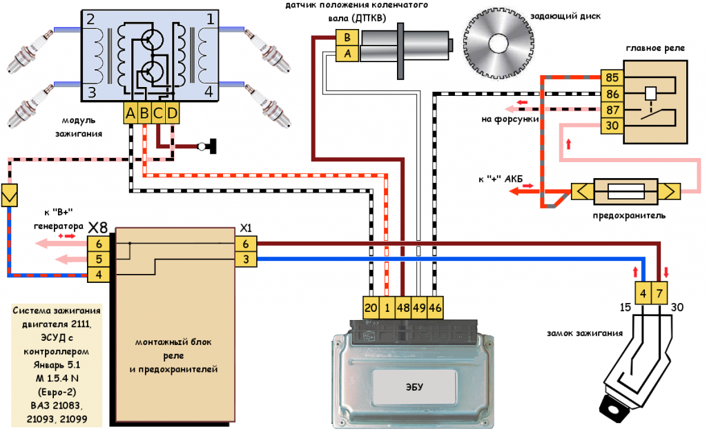 На схеме в начале статьи изображена электрическая схема системы зажигания двигателя 2111. Если в каком-либо из проводов системы имеется обрыв — система зажигания работать не будет.