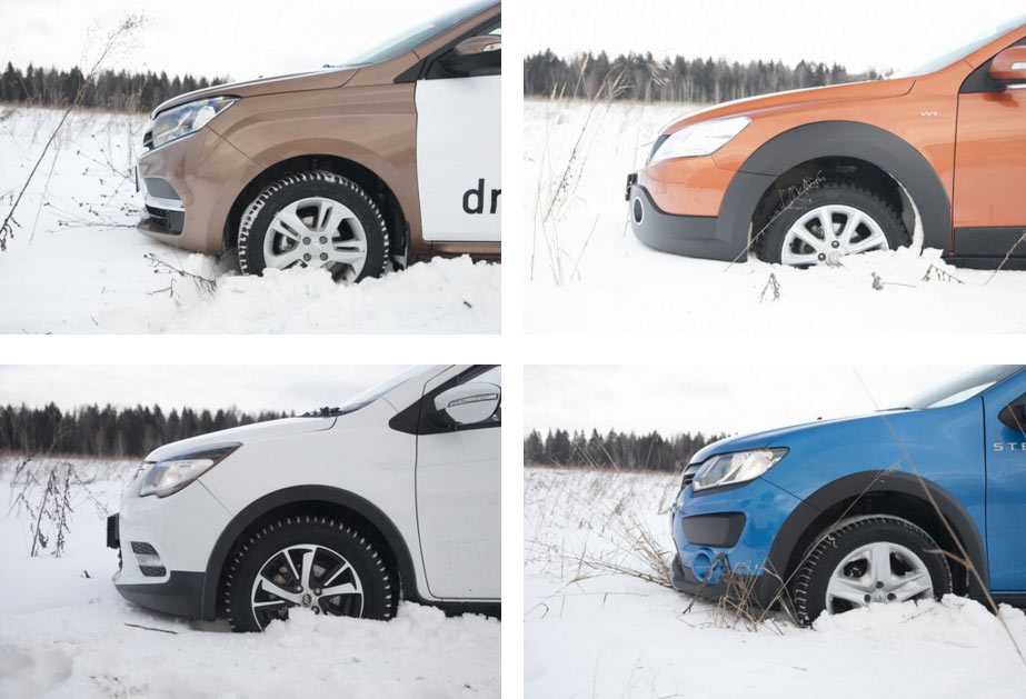 Наличие только переднего привода у всех испытуемых, конечно же, сильно снижает их проходимость. Тем более что и дорожный просвет у всех автомобилей лежит в весьма скромном диапазоне —175–195 мм. Самый скромный — у хэтчбека Donfeng, максимальный — у одноплатформенных Renault и Lada, а посередине (185 мм) — Lifan. К тому же у всех кроссоверов обнаружились довольно длинные передние свесы, особенно своим «клювом» отличился Н30. ESP отсутствует только на Donfeng, у Х50 ее можно отключить, а у остальных двоих ее, напротив, нельзя деактивировать. Но мы все же попробовали пробиться на них по целине с тяжелым размокшим снегом. Возможно, на фото и видео эти условия выглядят безобидно, но на самом деле для переднего привода это непросто: автомобили банально нагребают под днище кучу снега и «зависают» на «морде». Вроде бы решает клиренс? Но, как ни странно, победил в этом испытании автомобиль с самым низким дорожным просветом — Dongfeng. Именно ему удалось продраться дальше других, правда, он стал и единственным, кого пришлось потом выталкивать. Lifan явно бережет вариатор и не позволяет как следует раскрутить мотор даже с отключенной ESP, поэтому «догнать» Н30 ему не удалось. К тому же у Лифана — самые «слабые» шины: Amtel NordMaster 2. Они показались даже менее удачными, чем установленные на Dongfeng Nordman 4. Ну а хуже всех выступили «братья» на Michelin X-Ice — Lada и Renault, которые при возможности отключения систем стабилизации, скорее всего, оказались бы в лидерах.