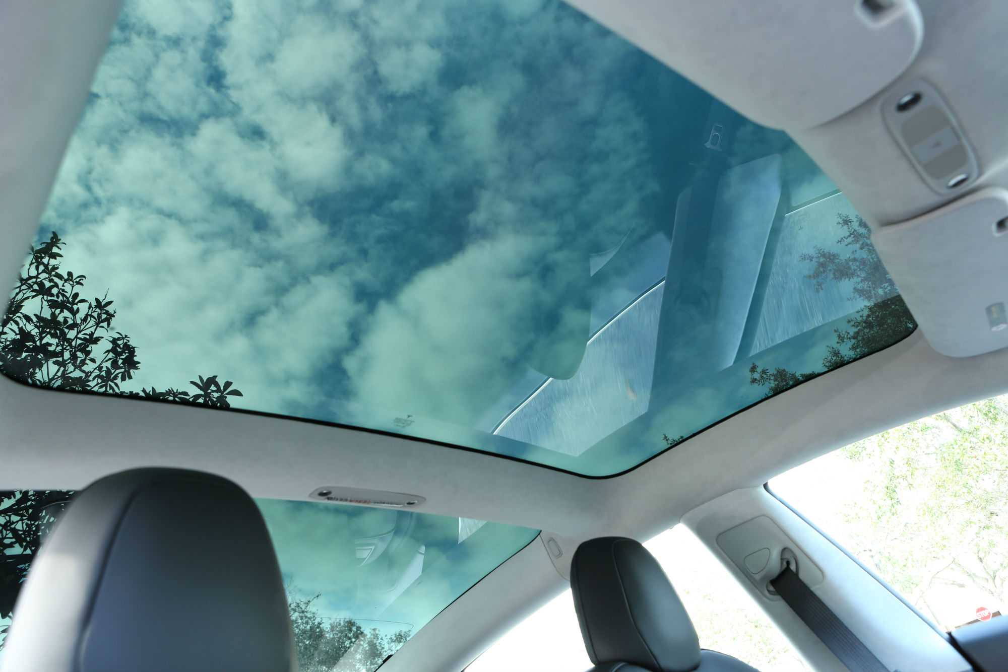 Основной «фишкой» интерьера Model 3 можно по правду считать большую панорамную крышу. Фактически за исключением небольших участков, вся крыша «трешки» является прозрачной. И да это тоже опция, а в нашем случае часть «премиум» пакета. У базовых автомобилей крыша будет металлической.