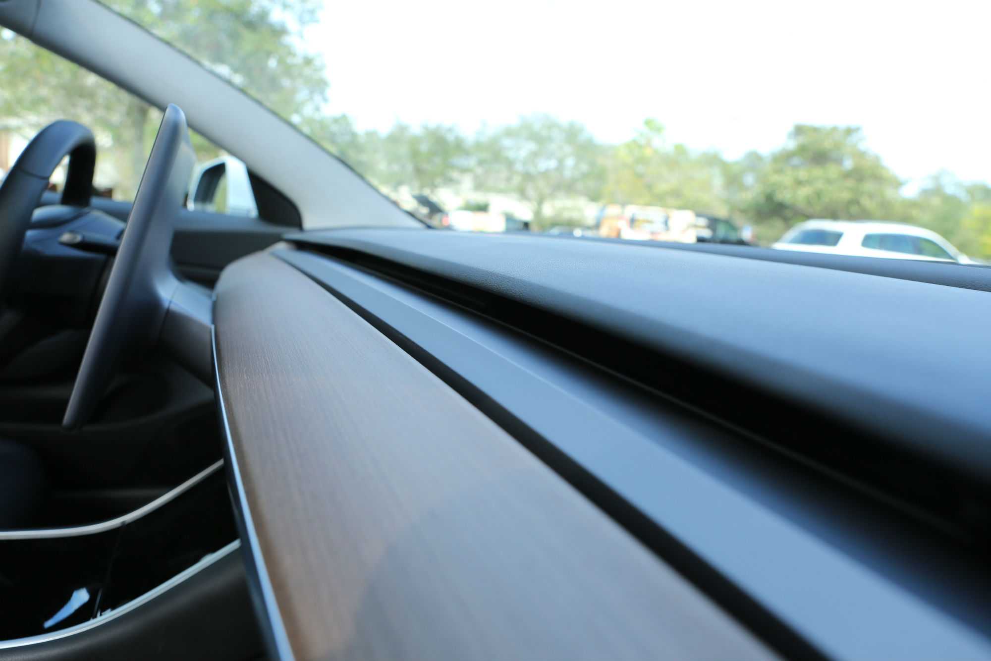 Традиционной панели приборов в «трешке» просто нет. Нет ни приборов, ни кнопок. Как говорили во времена тотального дефицита: «На прилавке шаром покати». Отделка консоли «шпоном» светлых пород дерева не спасает ситуацию и скорее напоминает пластиковый плинтус со строительного рынка. В том месте, где он нависает над рулевой колонкой, несложно нащупать рваный край, будто обрезанный ножовкой по металлу. По центру гордо расположился горизонтальный 15-дюймовый экран, который и вобрал в себя все органы управления и индикации.