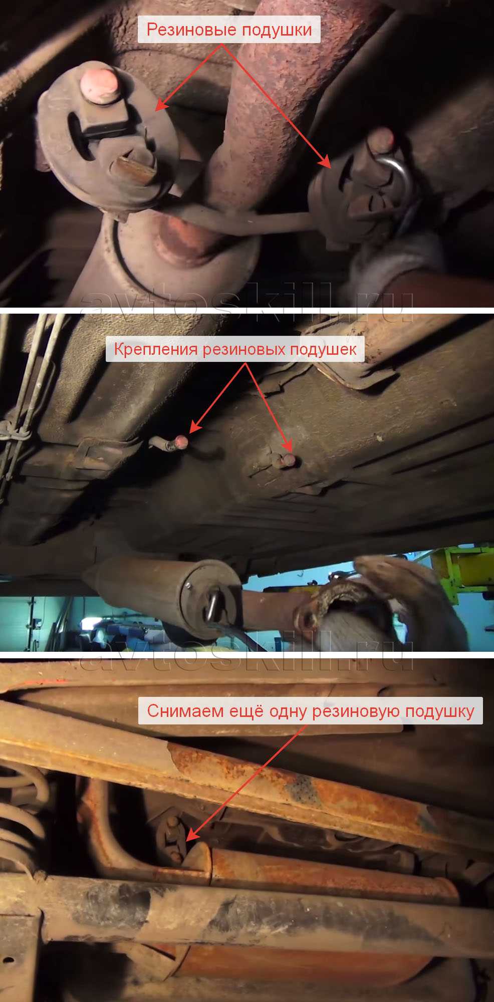 Затем глушитель снимается с резиновых подушек, которые амортизируют его.