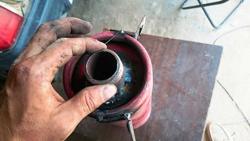 - От огнетушителя отворачивается головка, высыпается оставшийся порошок. Отверстие расширяется до такого размера, чтобы приготовленная труба входила достаточно плотно.