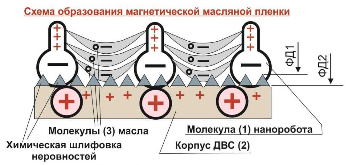 - Молекулы «Наноробота» имеют ярко выраженный отрицательный заряд на одном конце и распределенный по остальной поверхности более слабый положительный заряд. Отрицательный заряд образует сильное электромагнитное взаимодействие с положительно заряженной поверхностью металла. Такая связь облегчает прилипание (водородную связь) «масло + металл». Свободные молекулы масла образуют водородную связь с положительно заряженными «хвостами» молекулы препарата.При этом образуется очень толстая масляная пленка. Расположенные перпендикулярно поверхности трения молекулы «наноробота» препятствуют стеканию с нее масла, увеличивая прочность пленки. Этот эффект называется «молекулярный ворс».Пример: Разлитая вода на ковре не растекается, а поверхность ковра становится очень скользкой.