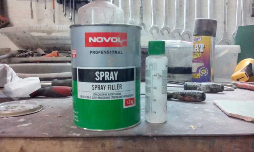 5) Подготовьте автомобильную шпатлевку с отвердителем, и разведите ее в соответствии с рекомендациями производителя. Шпатлевка после разведения с отвердителем пригодна для работы в течении 2-3 минут.