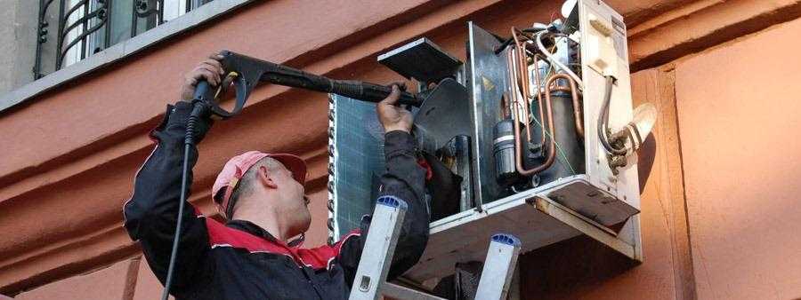 Самая сложная процедура из-за труднодоступности наружного блока. Проводится она 1-2 раза в год с помощью мощного пылесоса, которым из оборудования выдувается листва и пыль