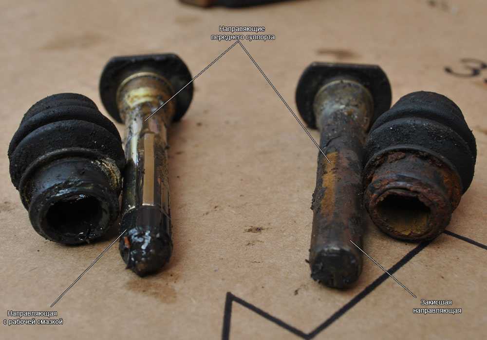 Ремонт данной неисправности своими руками не составит трудности. Кстати, в этом случае нет разницы при разборке как переднего, так и заднего суппорта. Для этого необходимо открутить и вытащить обе направляющие. Очистить их от грязи или некачественной смазки, снять и заменить порванные пыльники новыми, предварительно забив их специальной смазкой для суппортов.