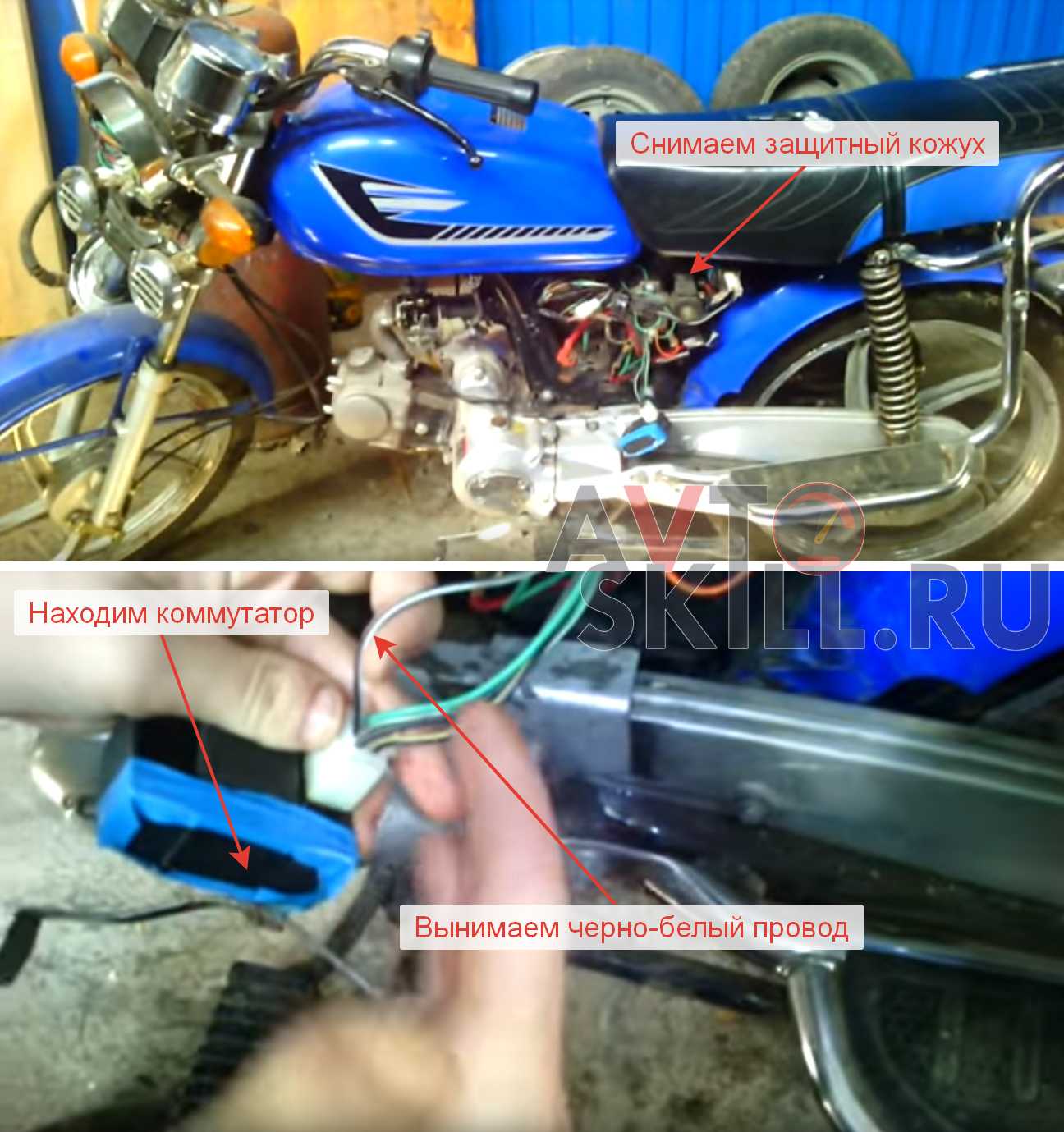Для его отключения нужно будет снять защитный щиток замка зажигания. Под ним находиться по стандарту 4 провода, белый, черный, красный и зеленый — с помощью этих проводов подается питание. Оставшийся проводок это и есть коммутатор, после его отключения мопед можно завести с помощью кикстартера.