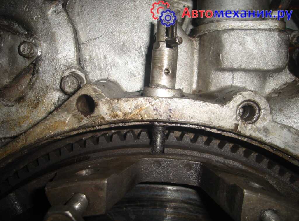 Регулировку желательно проводить вдвоём с напарником, так как проворачивать коленчатый вал необходимо снизу автомобиля и желательно использовать при этом смотровую яму. В картере маховика имеется специальное окно, а на самом маховике отверстия. Если через смотровое окно вставить в эти отверстия прут соответствующего диаметра, то при его помощи маховик легко проворачивается на длину технологического окна, когда прут упрётся в одну сторону окна с другой появиться другое отверстие, и переставив в него прут мы сможем продолжить вращение маховика. Маховик необходимо вращать по ходу вращения коленчатого вала, как он вращается при работающем двигателе. На картере маховика сверху имеется стопор. А на маховике углубление, когда стопор войдет в это углубление маховик примет положение, соответствующее положению поршня первого цилиндра в ВМТ.