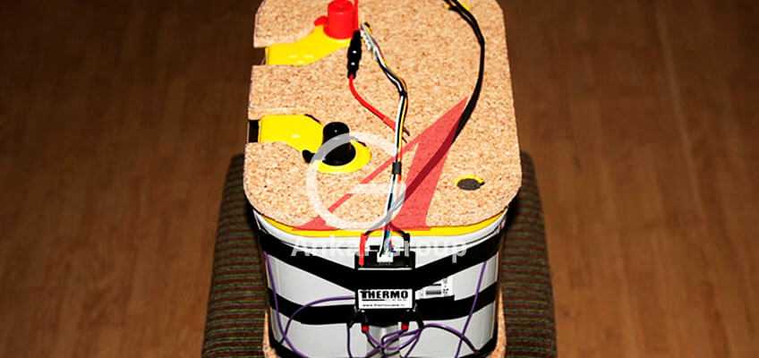 Пенопласт лучше склеивать клеем, а фольгоизол скрепляется скотчем. По такому же принципу делается крышка. Термокамера для АКБ готова. Минус его заключается в том, что тепло от мотора в таком случае поступать не будет, а при зарядке АКБ излучает слишком мало тепла.